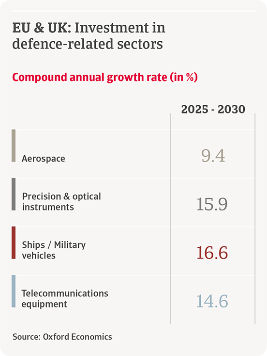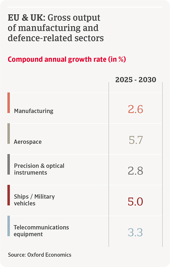 Malgré les doutes sur l’ampleur du rebond industriel, il y aura clairement des gagnants dans la course européenne au réarmement. Un sous-ensemble concentré de secteurs à forte intensité capitalistique enregistrera la plus forte croissance de production au cours des cinq prochaines années. Il s’agit notamment des navires et véhicules militaires, de l’aéronautique, des instruments de précision et optiques, ainsi que des équipements de télécommunication. Comparés à l’ensemble du secteur manufacturier, ces secteurs afficheront une croissance de la production brute supérieure à la moyenne dans l’UE et au Royaume-Uni au cours des cinq prochaines années.